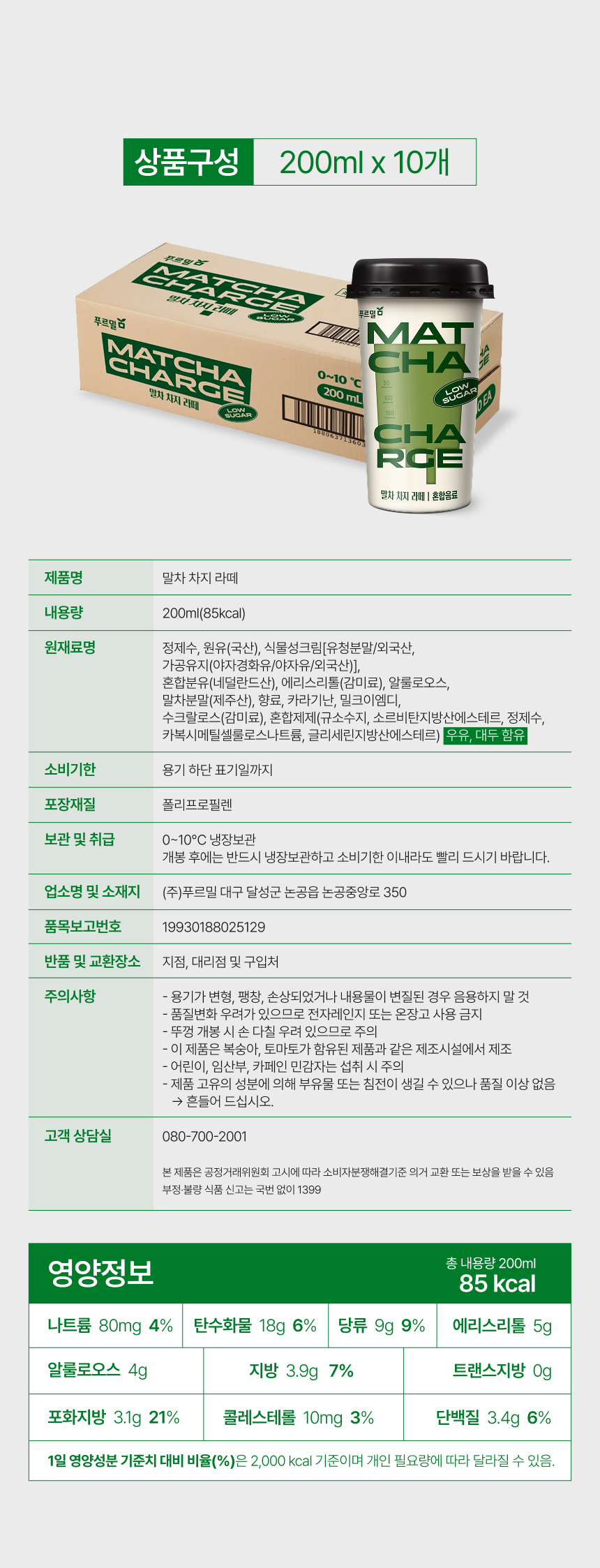 제품명 | 말차차지라떼 | 식품 유형 | 혼합음료 | 내용량 | 200 ml |
